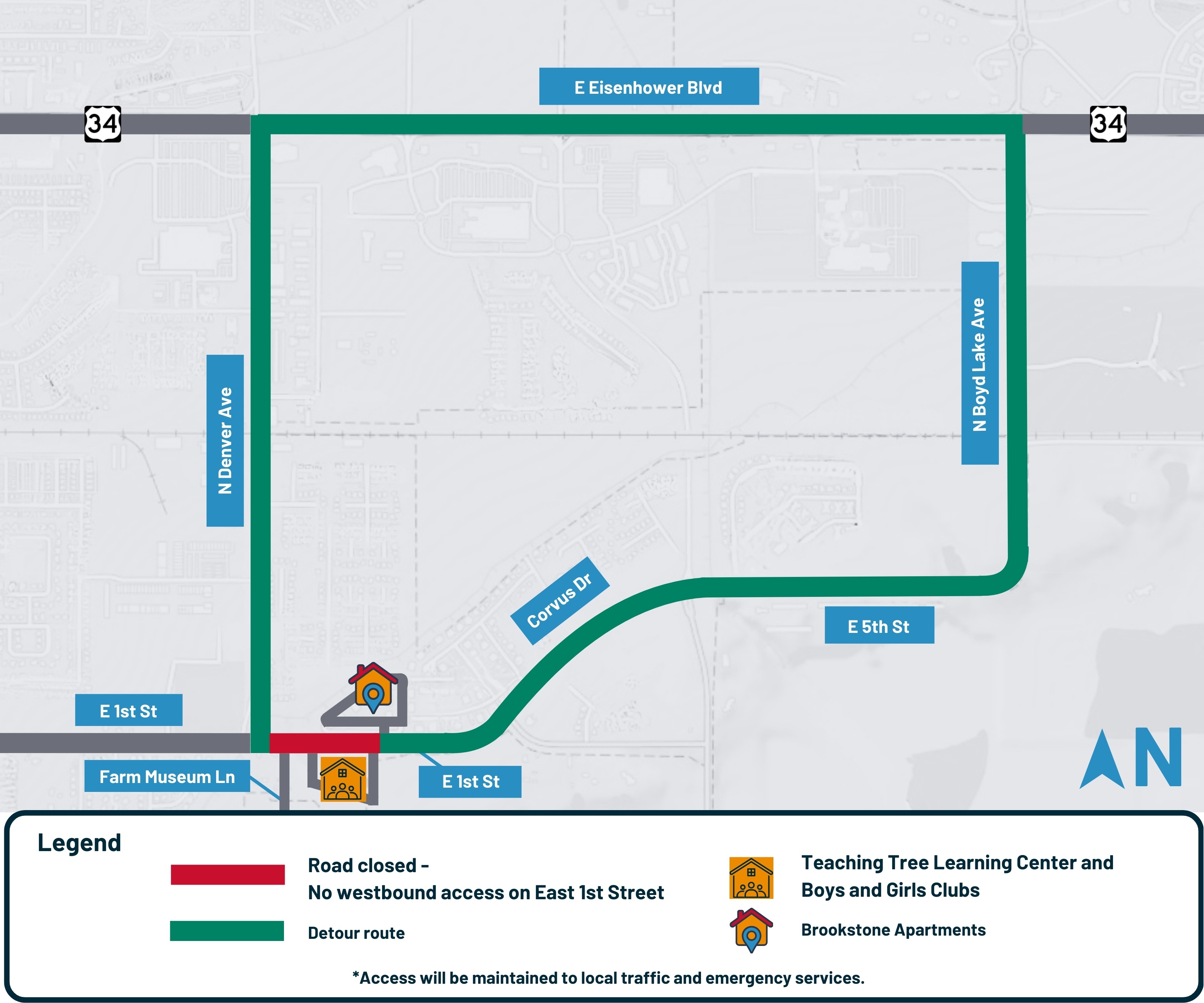 During construction, traffic control measures will be in place to maintain safe travel through the area. Temporary traffic pattern changes should be expected on East 1st Street and, to a lesser degree, North Denver Avenue, but local access to residences and for business deliveries and customers will be maintained.