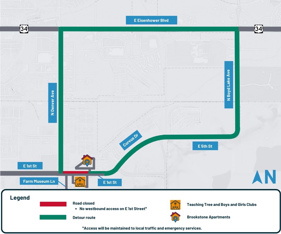 Work at the Farmer’s Ditch crossing will begin in early January and continue into February, weather permitting, when the ditch is inactive. At the intersection of First Street and Denver Avenue, deep excavation will require a full closure of First Street from Denver Avenue to Sculptor Drive for about four weeks. Eastbound First Street is scheduled to open in February, while westbound First Street is scheduled to remain closed through May 2026. Detours will be available via U.S. Highway 34 or Mountain Lion Avenue.