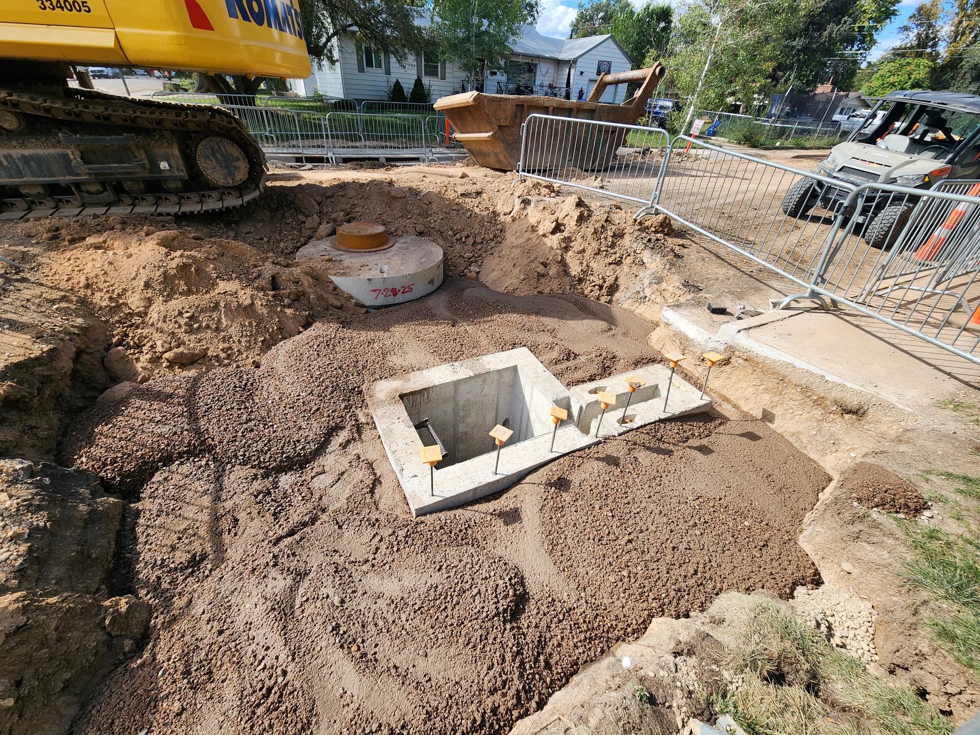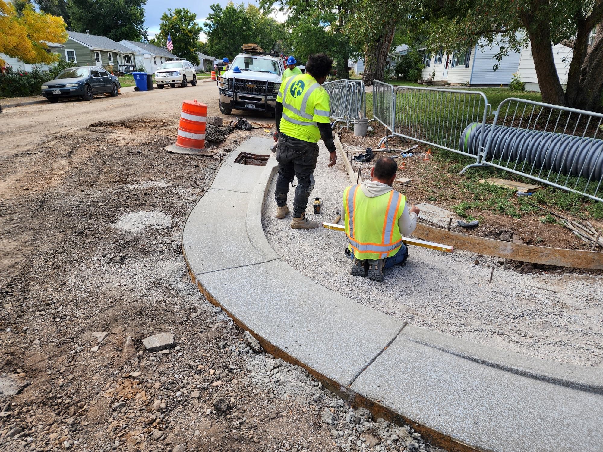 • The concrete crew is installing curb and gutter at Roosevelt Avenue and 11th Street (Barnes Place); Harrison Avenue and Barnes Place; Grant Avenue; N. Franklin Avenue; and Colorado Avenue. Curb and gutter will be installed over the existing boxes of the abandoned Barnes Ditch, which no longer carries water. Old inlets are also being removed to prevent water from entering the ditch.