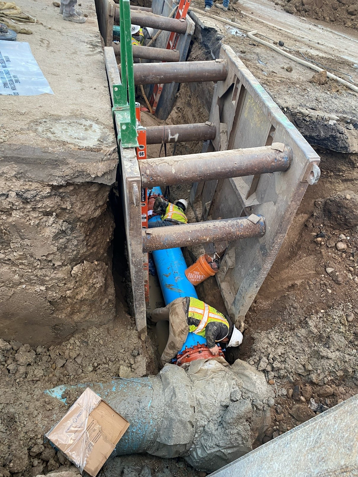 - Work slowed as crews approached the intersection because of a large amount of known and unknown underground utilities that prevented the use of conventional excavators. Crews were forced to carefully snake and construct the new waterlines around these utilities.