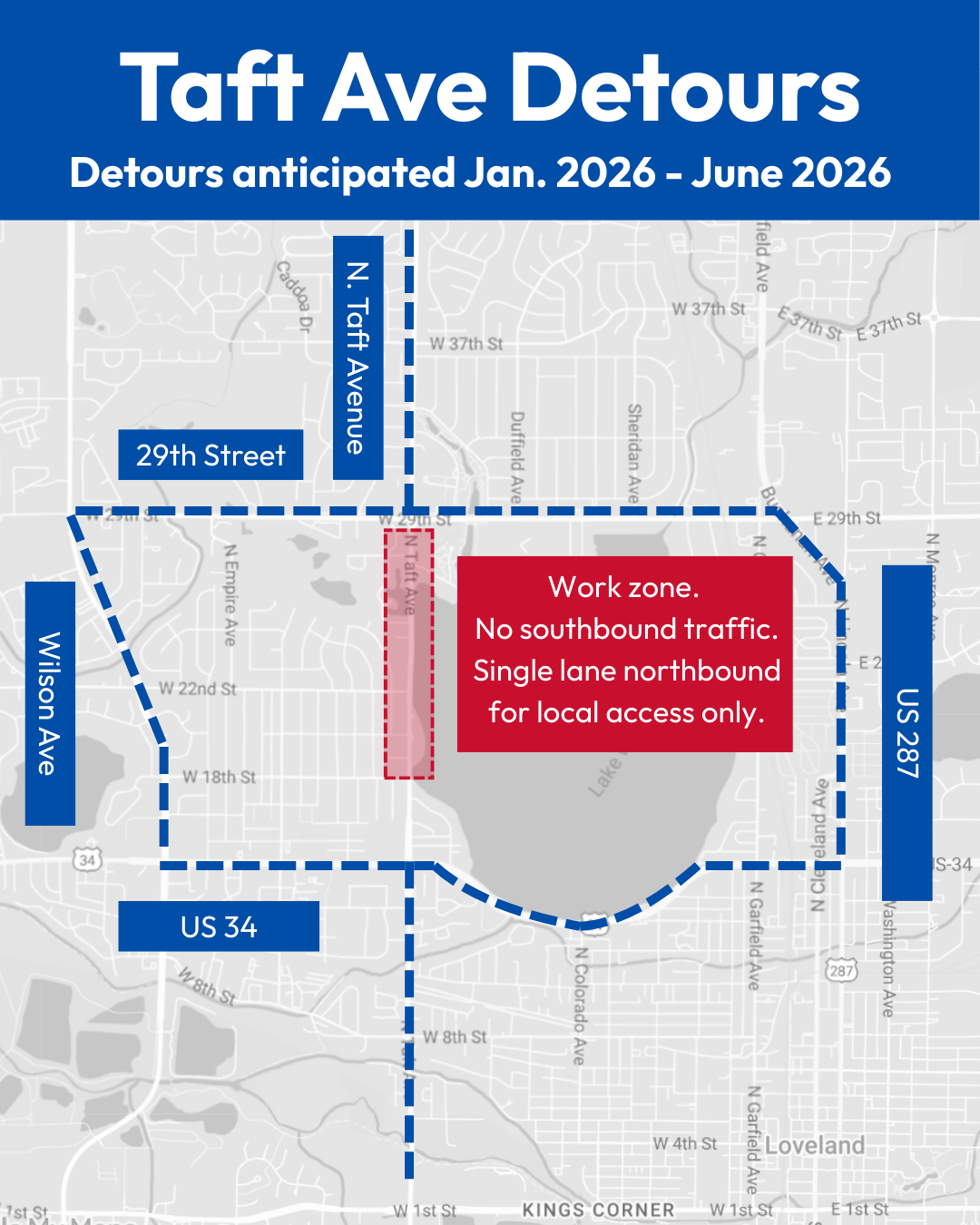 Crews will replace aging waterlines and stormwater infrastructure along North Taft Avenue from 18th Street through West 29th Street. Work includes installing a new 16-inch waterline to replace the existing 12-inch cast-iron pipe, which will help maintain systemwide pressure, improve long-term reliability and reduce service disruptions caused by line breaks. Stormwater upgrades will include installing new pipes, adding outlets to Lake Loveland to improve storm protection and reinforcing the lake’s west bank to prevent erosion and protect nearby infrastructure.