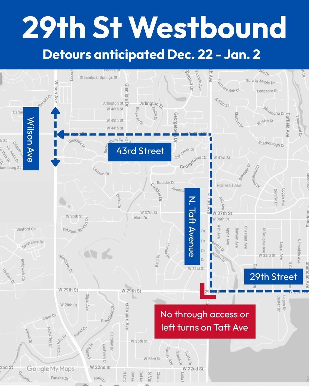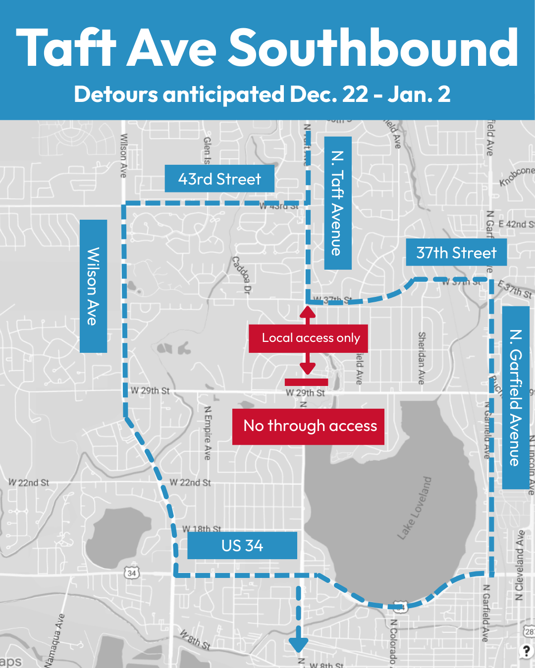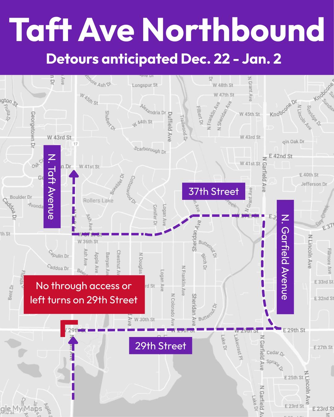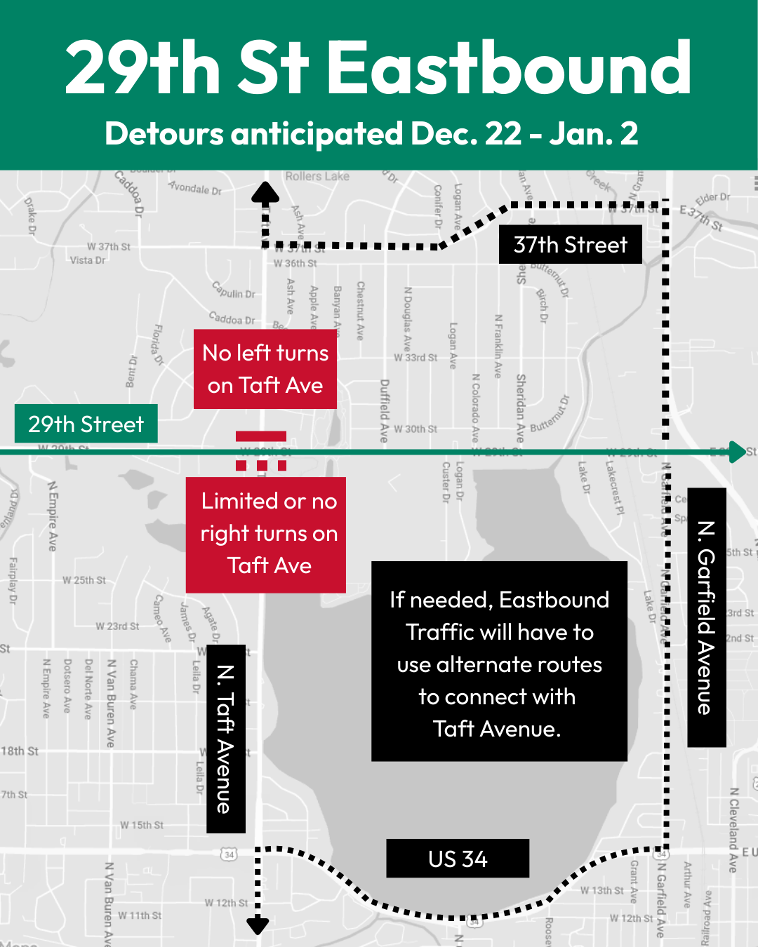 During construction, traffic control measures will be in place to maintain safe travel through the area. Both northbound and southbound lanes of North Taft Avenue north of 18th Street through 29th Street will be periodically closed or lanes restricted to northbound traffic, but local access to residences and for business deliveries and customers will be maintained.